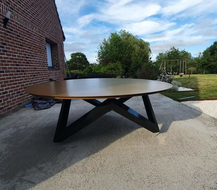 Le modèle de présentation est un diamètre 220cm et permet d’accueillir 14 personnes. Son plateau est en acier thermolaqué en RAL 1036 et ses pieds sont en acier thermolaqué RAL 7021.